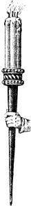 La torche est donc le plus vieux moyen d’éclairage utilisé pour le théâtre[viii]. Déjà à cette époque elle est connue depuis fort longtemps, s’étant substituée au simple rameau qui servait à prendre et à transporter la lumière du foyer principal où se conserve la flamme. C’est un procédé rudimentaire puisqu’il s’agit d’un bout de bois dont l’une des extrémités est enduite d’une matière inflammable (huile, graisse, résine, cire). Le moyen-âge connaîtra la torche faite de corde tordue. Elle est utilisée pour l’éclairage d’appoint; les Grecs s’en servaient, entre autres, pour s’éclairer à la fin de la procession marquant le premier jour des Dionysies ainsi que pour illuminer le toit de leurs maisons en signe de réjouissance lors de certaines fêtes. Cette pratique est devenue une tradition dont Sebastiano Serlio s’inspirera pour l’éclairage de ses spectacles.